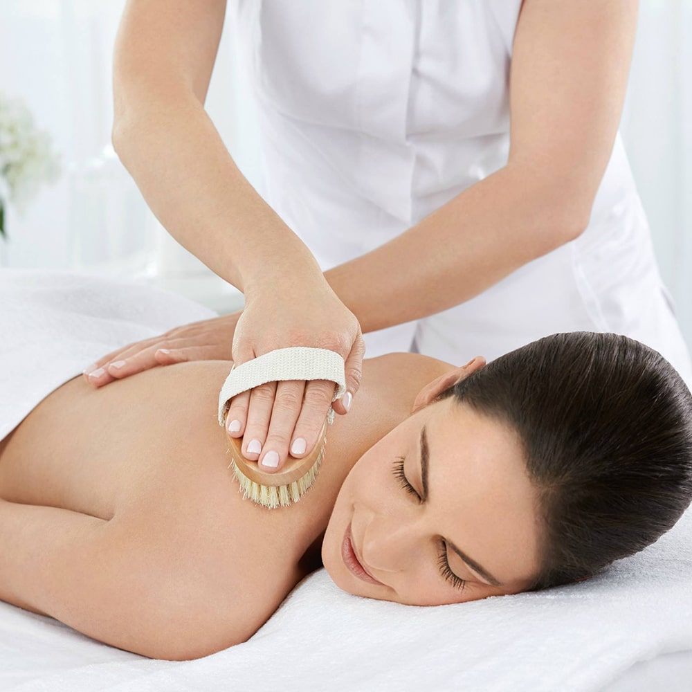 Brush your body dry every morning before showering. Work your way from the soles of your feet in long, wide movements towards your heart and concentrate on the areas that are particularly prone to cellulite.