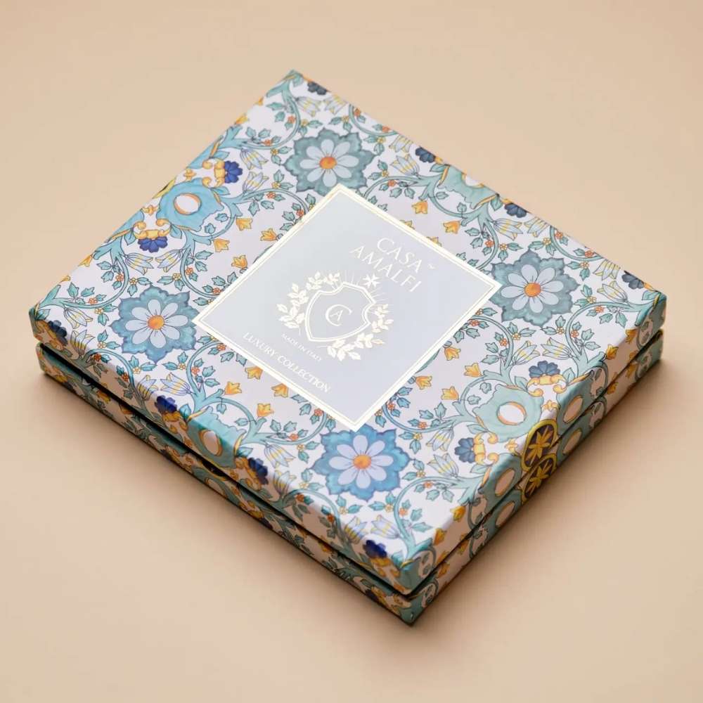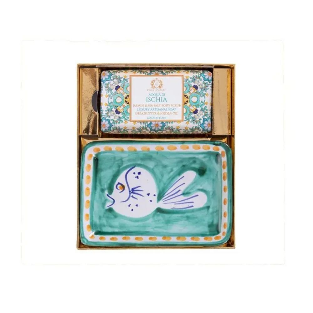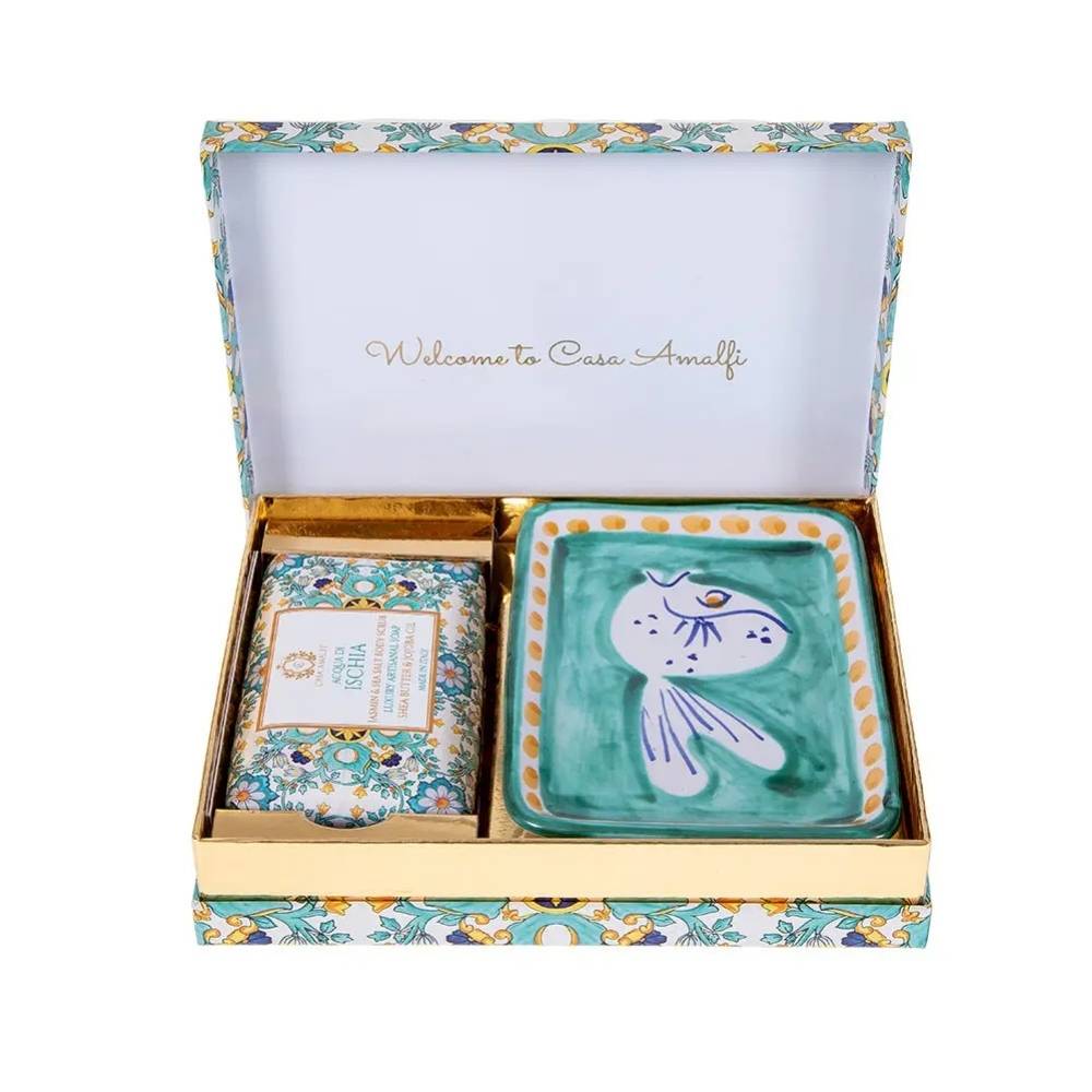 Casa Amalfi Acqua Di Ischia Single Gift Box – Luxus-Geschenkset mit Körperpeeling & handbemalter Seifenschale.