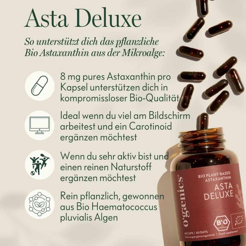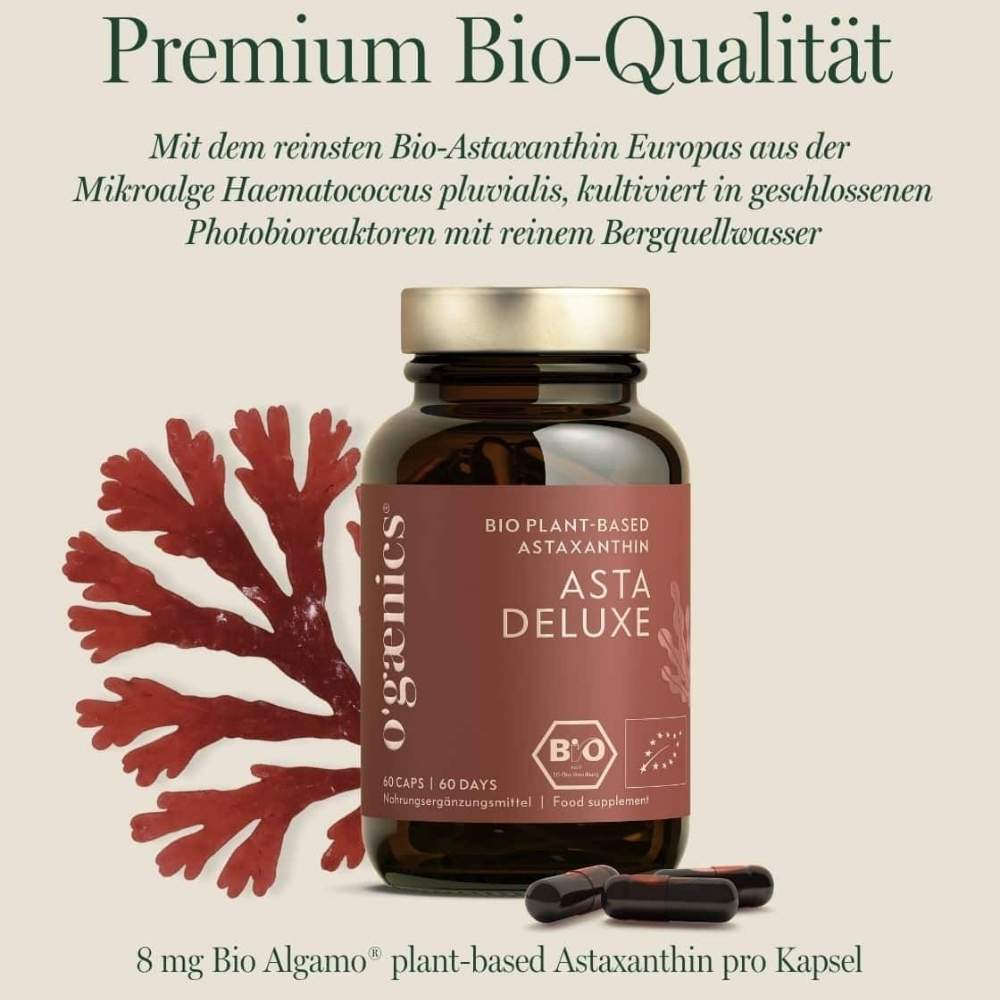 Asta Deluxe von Ogaenics ist ein hochwertiges Bio-Nahrungsergänzungsmittel mit natürlichem Astaxanthin aus der Mikroalge Haematococcus pluvialis. Jede Kapsel liefert 8 mg reines, biozertifiziertes Astaxanthin, gewonnen aus Algamo® Bio-Algen, die unter optimalen Bedingungen in Europa kultiviert werden – mit reinem Bergquellwasser in einem geschlossenen System für maximale Reinheit.