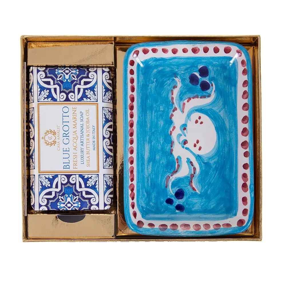 Dieses bezaubernde Geschenkset enthält eine handbemalte Keramikseifenschale, inspiriert von der zeitlosen Majolika-Kunst der Amalfiküste. Ergänzt wird das Set durch die Blue Grotto Acqua Marine Körperseife, die dreifach gemahlen und aus 100 % italienischem Olivenöl hergestellt ist.