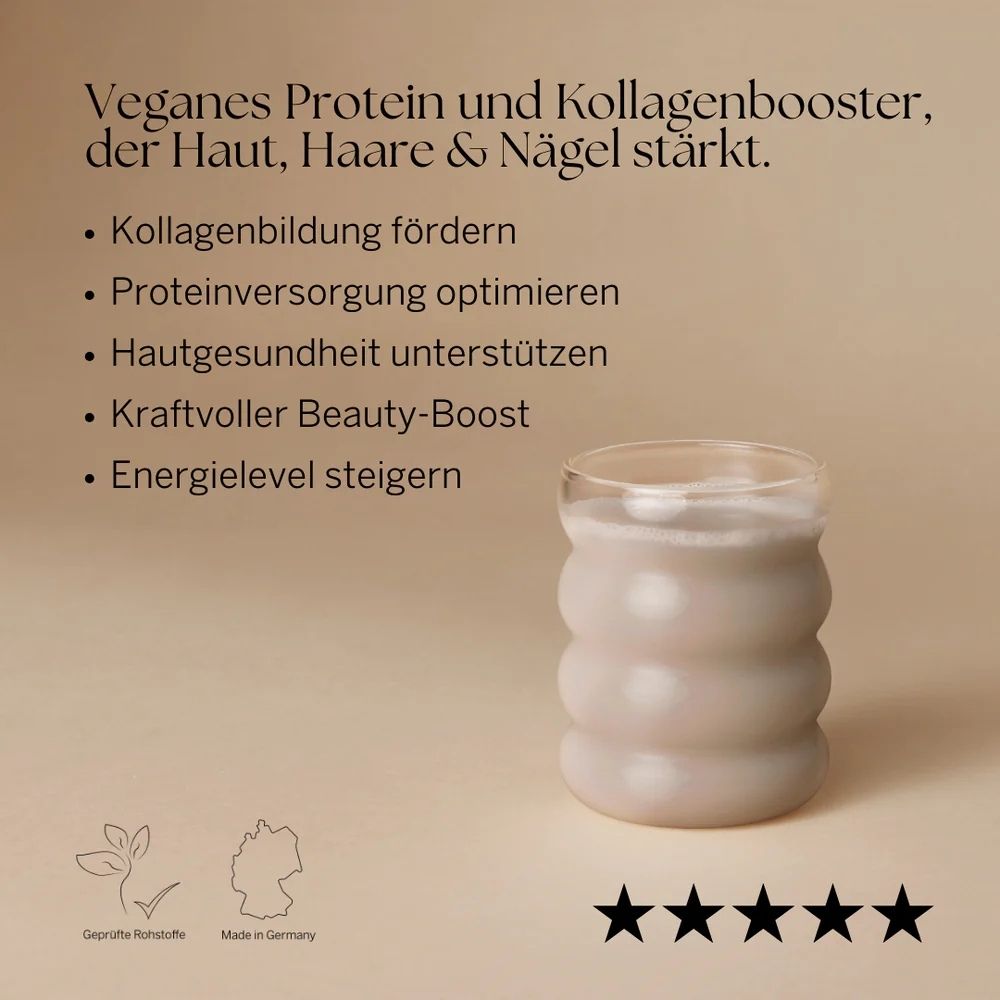 Reiseiweiß (38%), Erbseneiweiß (23%), Glycin, Hanfsameneiweiß (4%), L-Hydroxyprolin, L-Glutamin, Salz, Lucuma Pulver, L-Alanin, L-Arginin-Hydrochlorid, Aroma, Bambus-Extrakt, natürliches Aroma, Matcha-Grünteepulver, Camu Camu Extrakt, Natriumhyaluronat, Macapulver, Spirulina-Pulver, L-Prolin, Süßungsmittel: Steviolglycoside aus Stevia; D-Biotin.