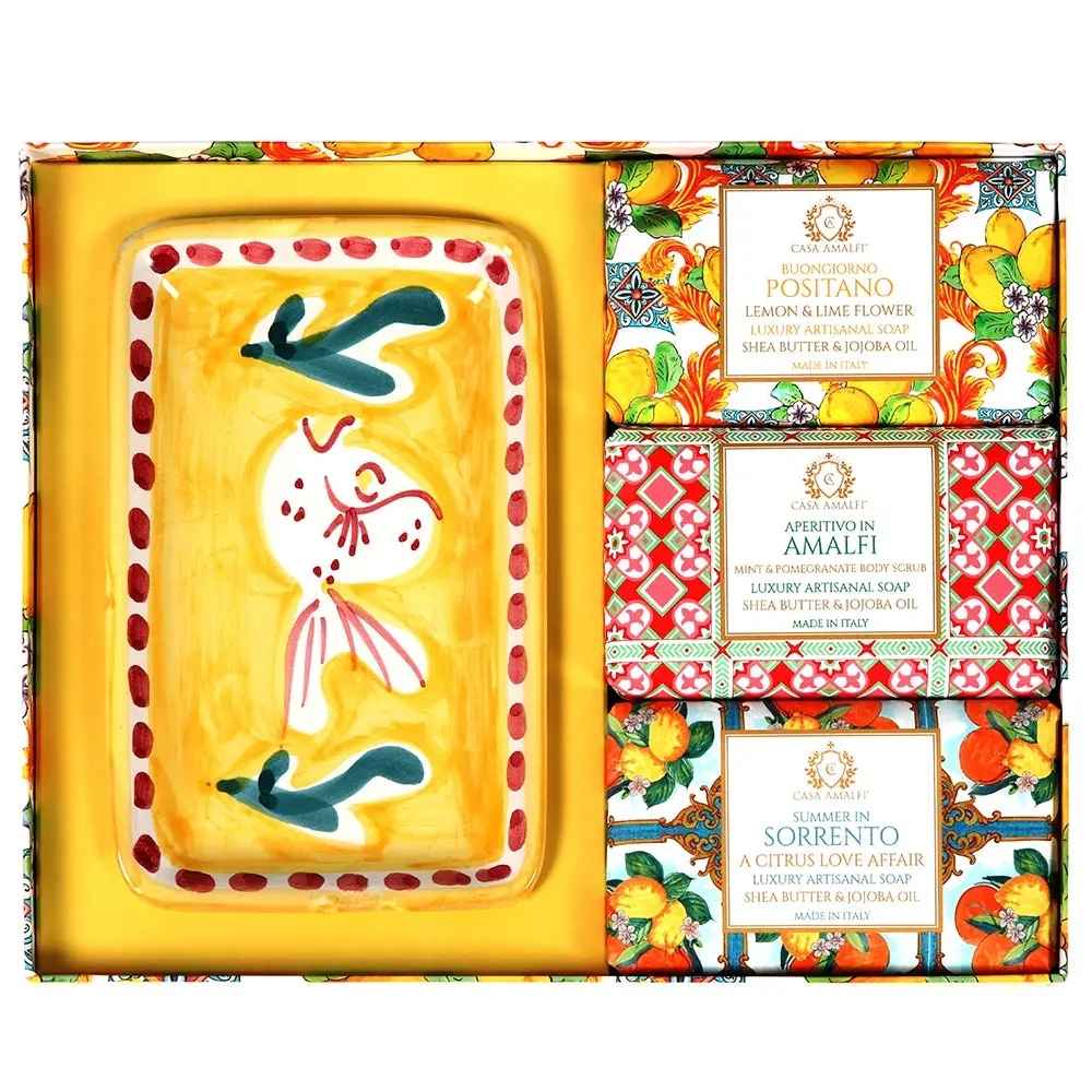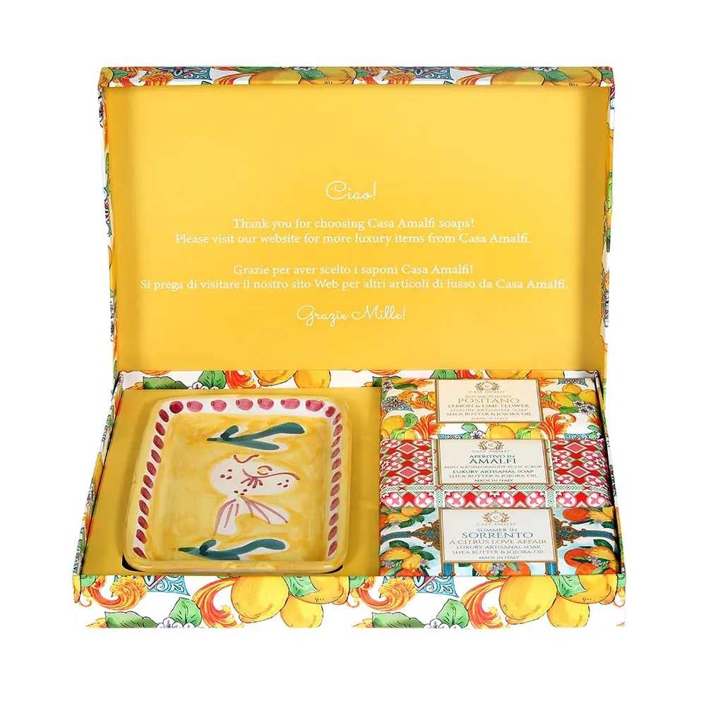 Abgerundet wird das Set durch eine handbemalte Keramikseifenschale, gefertigt von lokalen Kunsthandwerkern der Amalfiküste.
