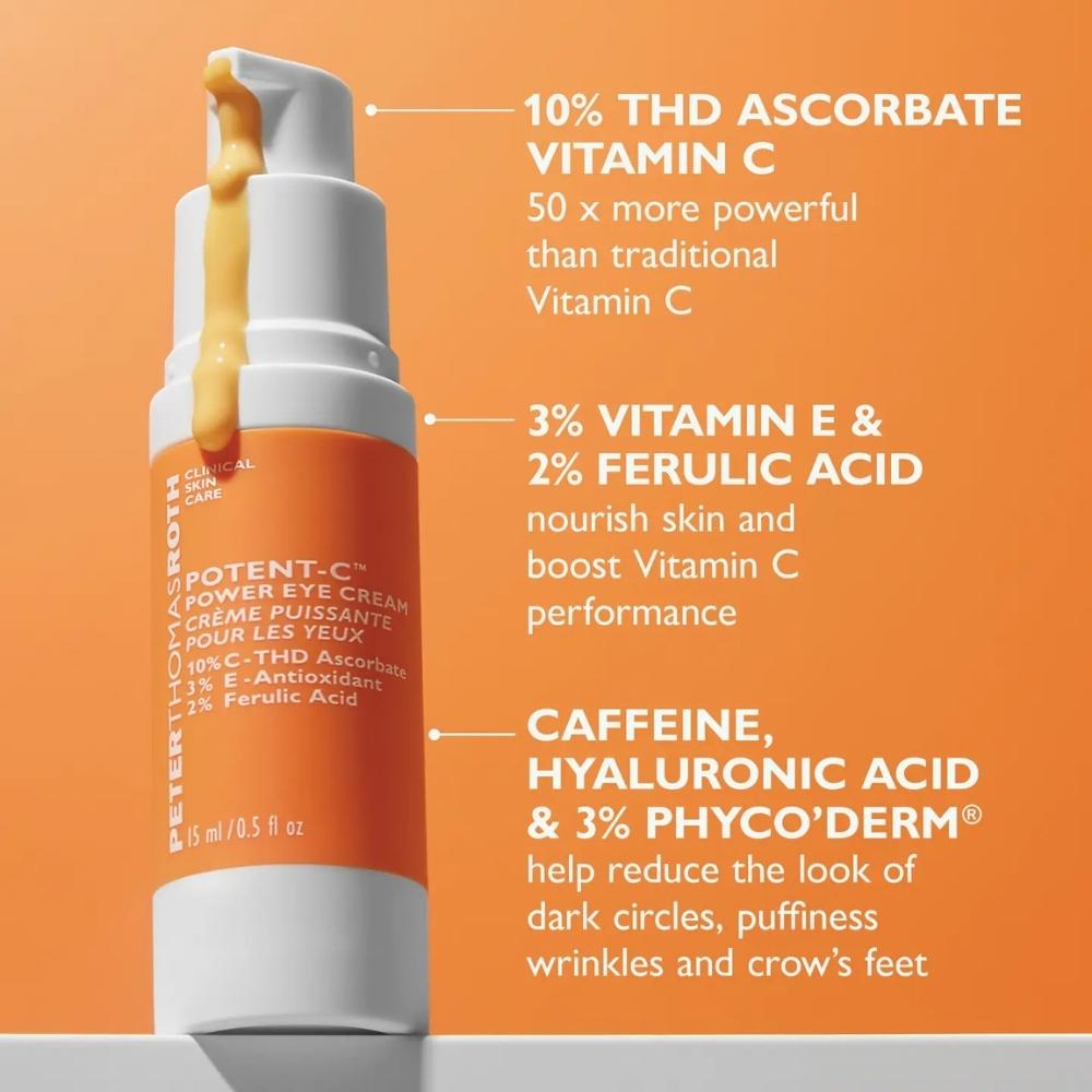 Die Potent-C™ Power Eye Cream von Peter Thomas Roth ist die perfekte Pflege für eine strahlende, glatte und jugendlich wirkende Augenpartie. Die innovative Formel mit hochpotentem Vitamin C (THD Ascorbat 10 %) sowie Vitamin E und Ferulasäure hilft, dunkle Augenringe, Schwellungen und feine Linien effektiv zu mindern – sofort und langfristig.