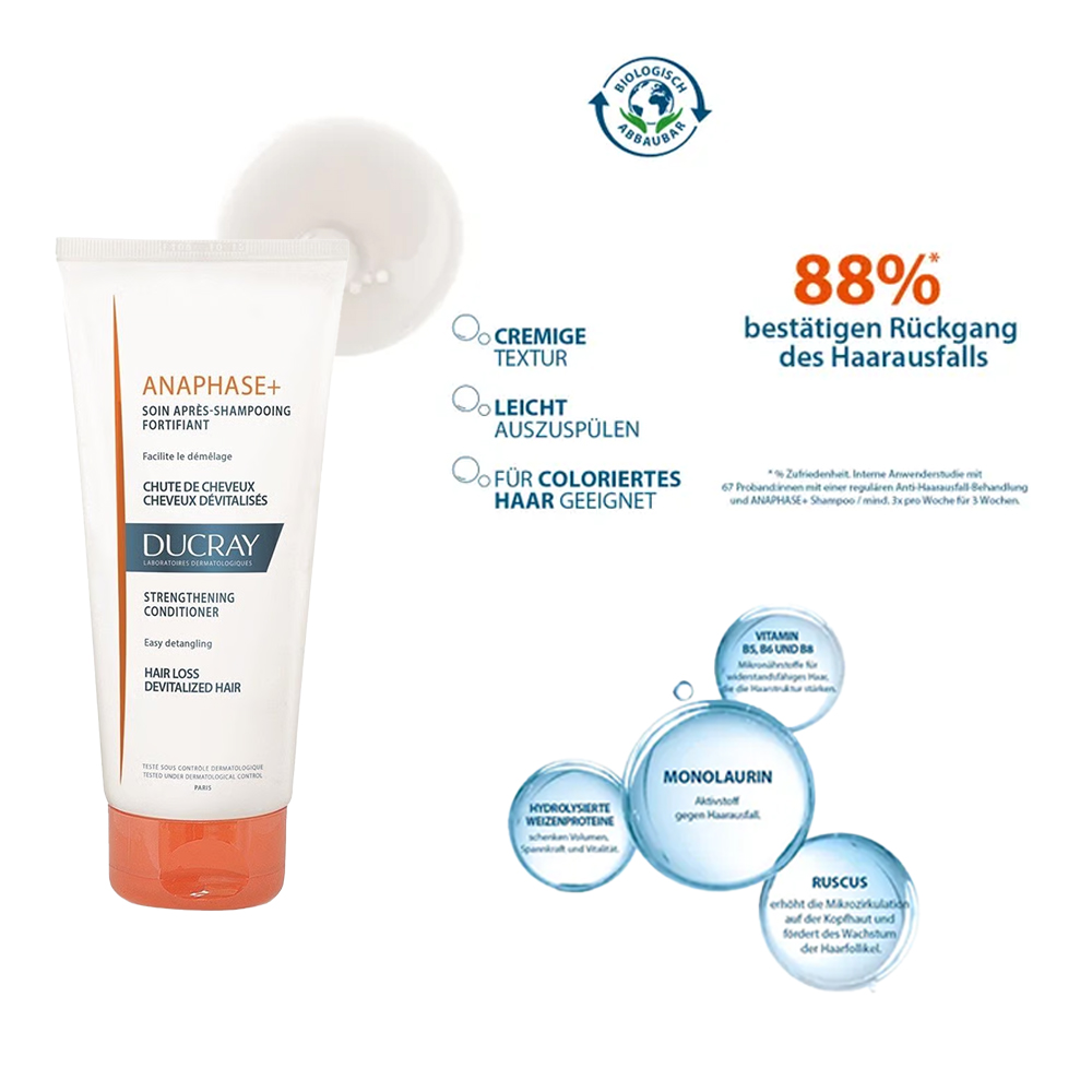 The ANAPHASE+ shampoo from Ducray is the perfect solution for reactive or chronic hair loss and ideal for fine, brittle hair. It stimulates the scalp, strengthens the hair from the roots and visibly increases volume. At the same time, it optimally prepares the scalp for subsequent anti-hair loss treatments.