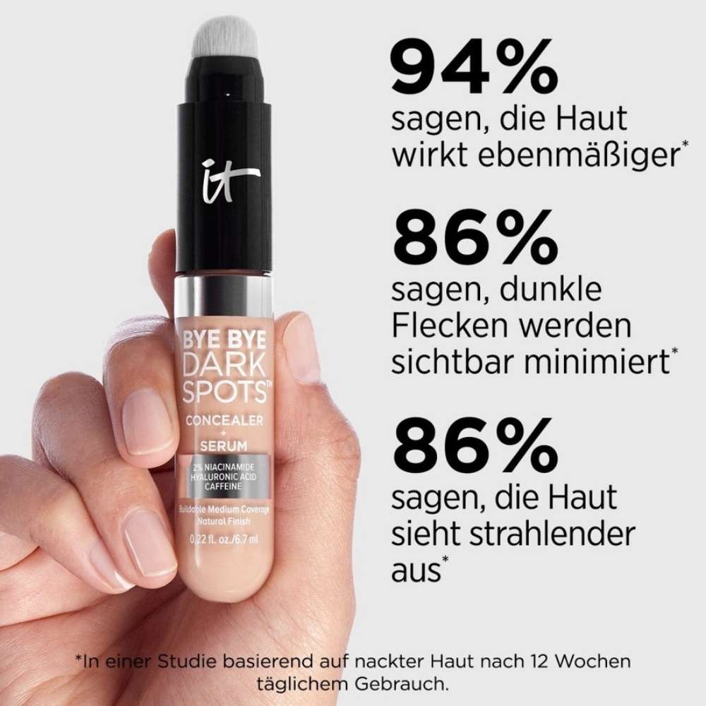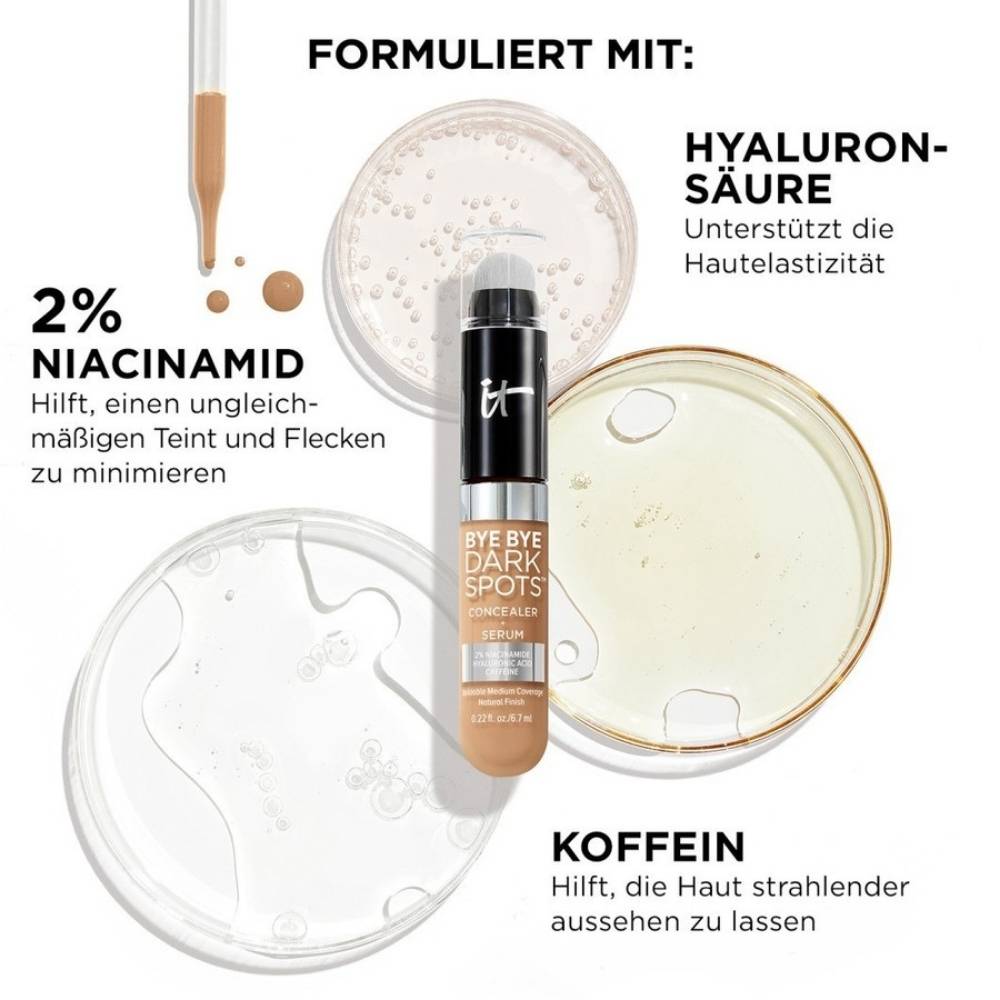 The IT Cosmetics Bye Bye Dark Spots Concealer + Serum is the perfect combination of highly pigmented concealer and nourishing serum. The buildable, medium coverage conceals dark spots, while niacinamide, hyaluronic acid and caffeine ensure a visibly more even complexion in the long term. The smooth texturedoes not settle into fine lines and leaves a naturally radiant finish.