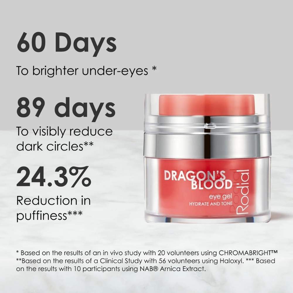 Revitalise tired eyes with Dragon's Eye Gel from Rodial, which refreshes and intensively moisturises puffy areas with dragon's blood, arnica, haloxyl and rose water. Hyaluronic acid soothes dry skin, refines the skin texture and ensures a smooth surface. At the same time, haloxyl and arnica work together to brighten the eye area and visibly reduce puffiness.
