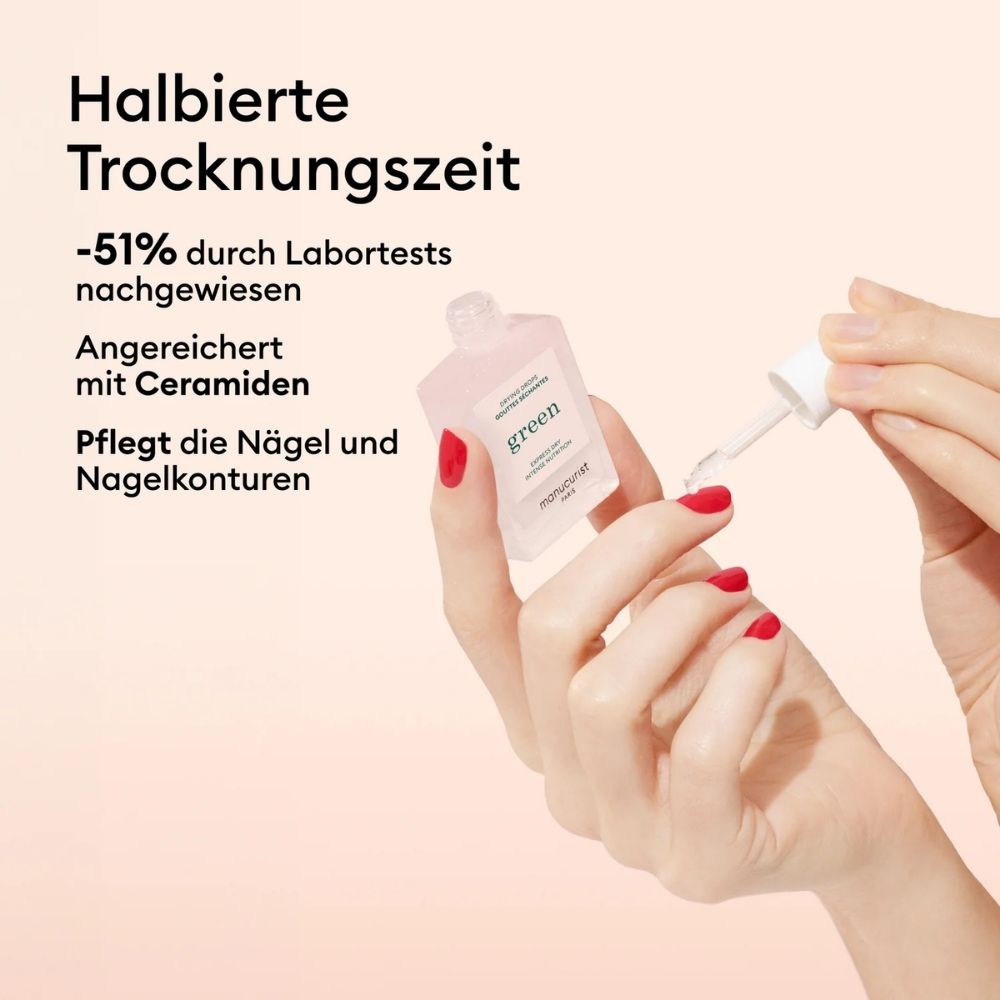 The Drying Drops from Manucurist reduce the drying time of Green™ nail polishes by half. Enriched with ceramides, they ensure a perfectly groomed nail contour. The practical pump cap makes application child's play and ultra-precise: one drop per nail is enough to finish the manicure! The natural solvents contain volatile compounds that ensure that the nail polish dries twice as fast. The formula exudes a gentle floral fragrance and offers intensive care for the nail contour thanks to the skin barrier-reinforcing argan ceramides.