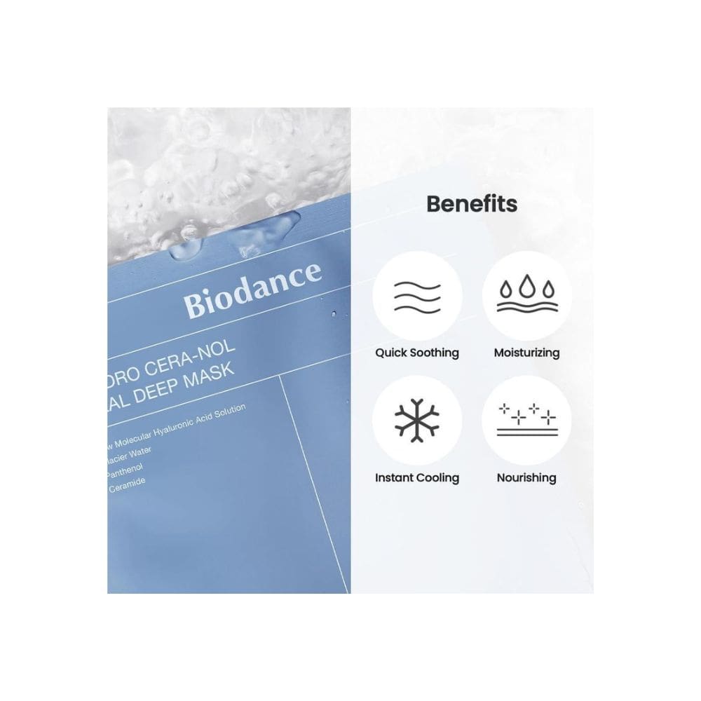 The Hydro Cera-NOL Real Deep Mask from Biodance consists of two parts that are specially designed for the upper and lower face. It is used overnight or for at least 3-4 hours to intensively moisturise the skin and promote its elasticity. The mask contains a combination of soothing and moisturising ingredients. Low-molecular hyaluronic acid binds water in the skin and provides intensive moisture. Panthenol supports regeneration and soothes irritation, while ceramides strengthen the hydrolipid barrier. Glacier water soothes the skin and makes it supple. Once the active essence has been fully absorbed, the mask becomes transparent.