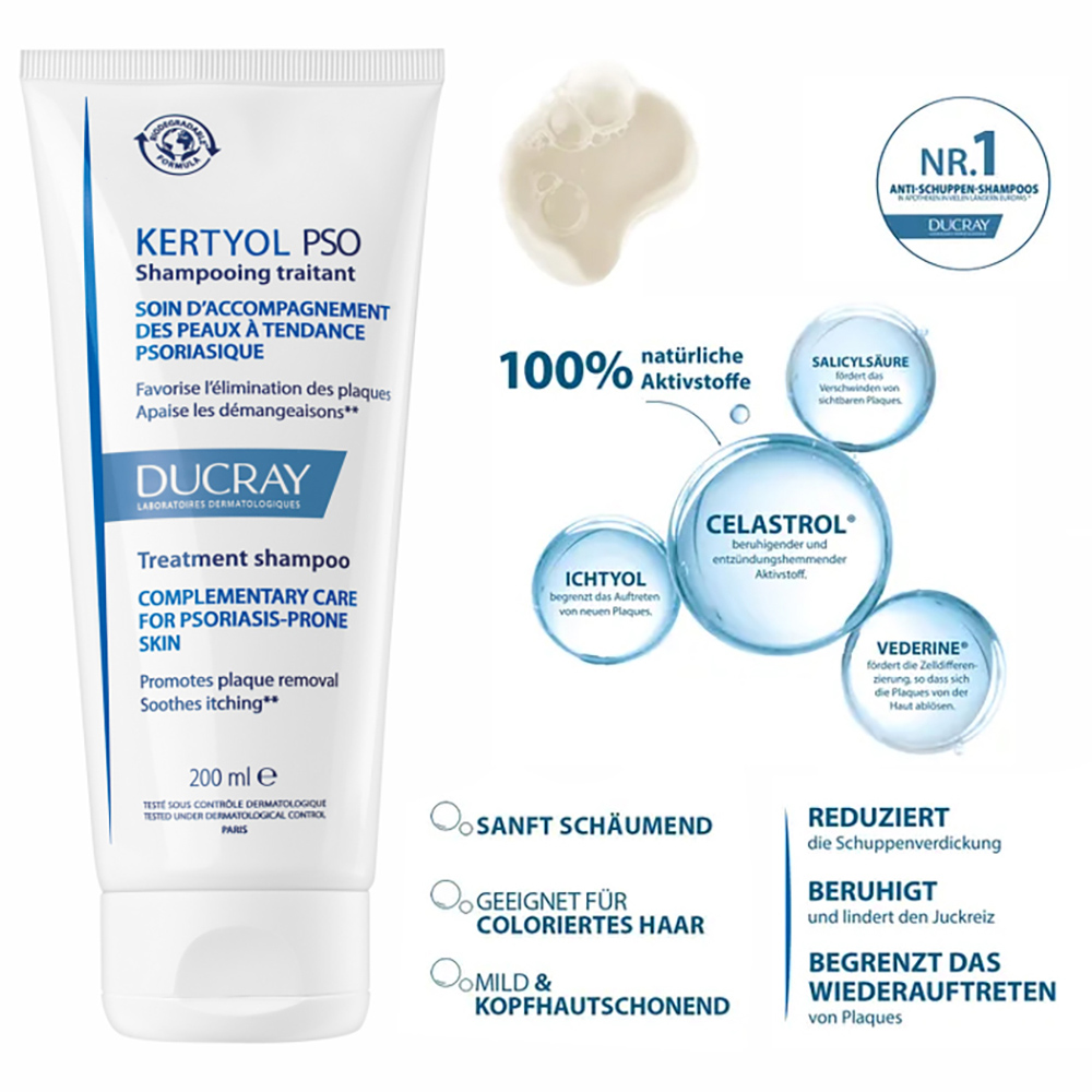 The KERTYOL PSO cure shampoo from Ducray is a special medical care product for scalps prone to psoriasis. Developed in close collaboration with dermatologists and patients, this shampoo offers an effective solution to relieve itching, reduce psoriasis plaques and strengthen the skin barrier.