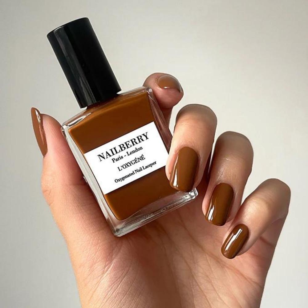 L'OxygénéCoffee by Nailberry is a warm, rich brown nail polish - Opaque.The rich, glossy brown with its subtle aroma reminiscent of freshly roasted coffee beans soothes and adds an elegant touch to the style at the same time. It flatters all skin tones and nail lengths and can be worn during the day as a subtle nude shade or in the evening as a luxurious accent that radiates depth and elegance. The patented formula provides a smooth, streak-free finish with just one stroke that won't clump or crack.