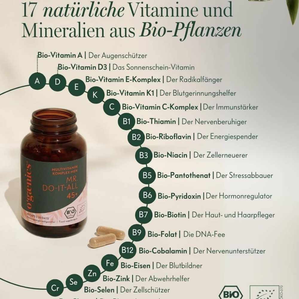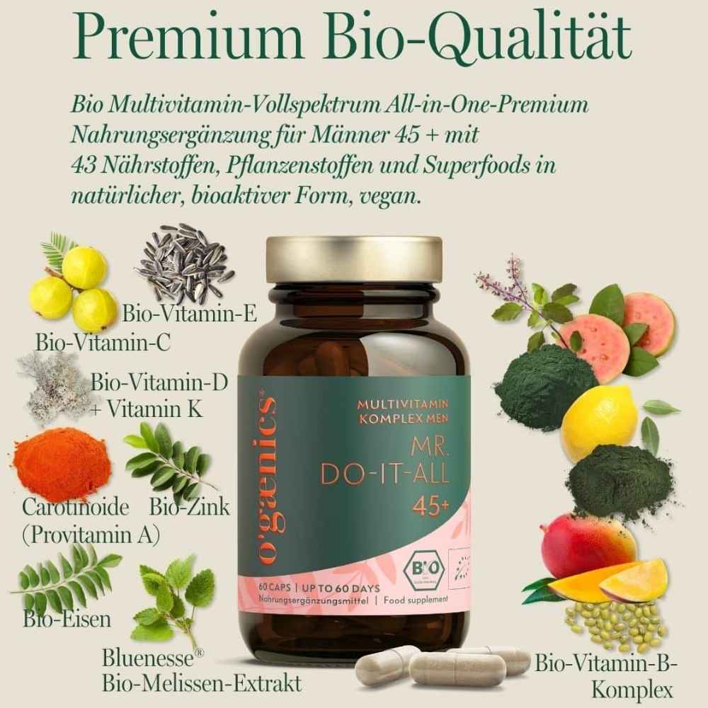 MR. DO-IT-ALL 45+ is 100% vegan, additive-free, GMO-free and packaged in high-quality apothecary jars. It is manufactured in Germany and offers the best possible bioavailability.