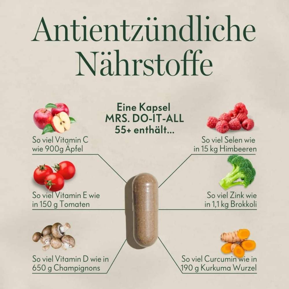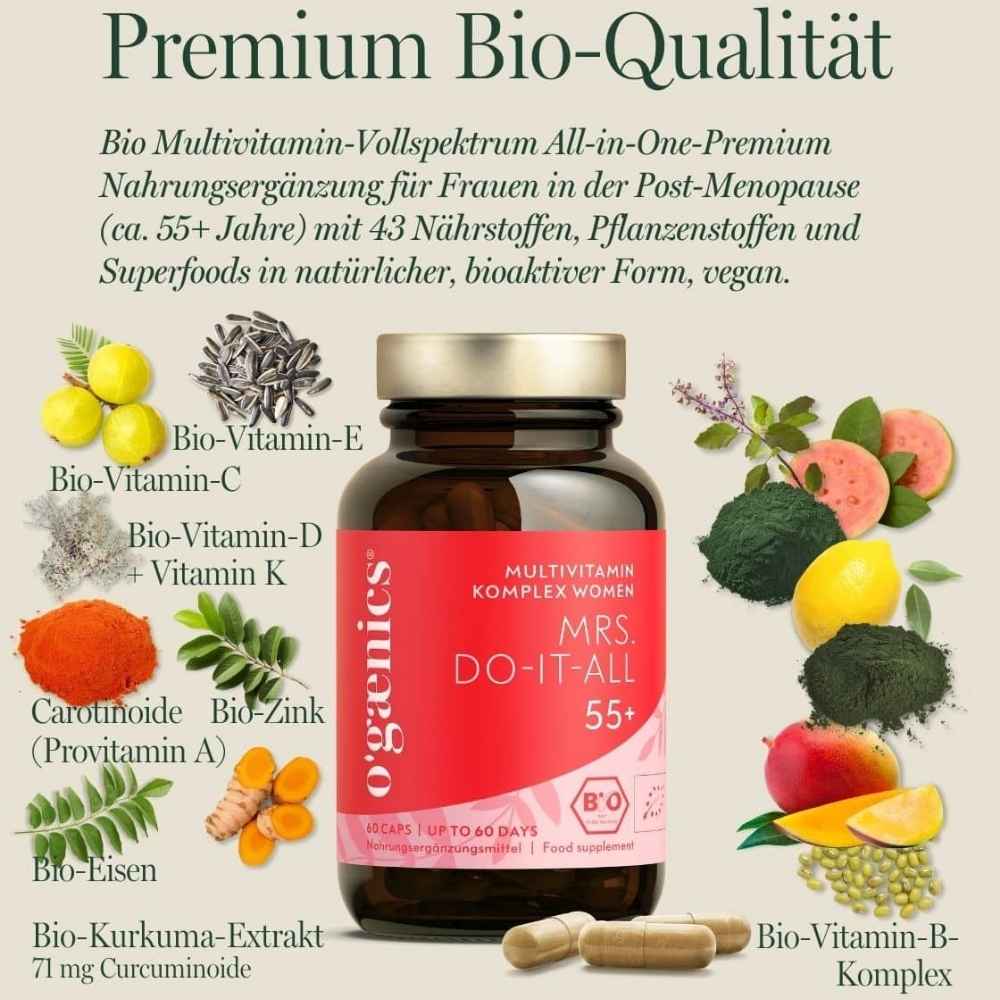 MRS. DO-IT-ALL 55+ is the perfect multivitamin for post-menopausal women that supports your health with organic quality and herbal efficacy. Experience how natural plant power helps you to age healthily and maintain your vitality.