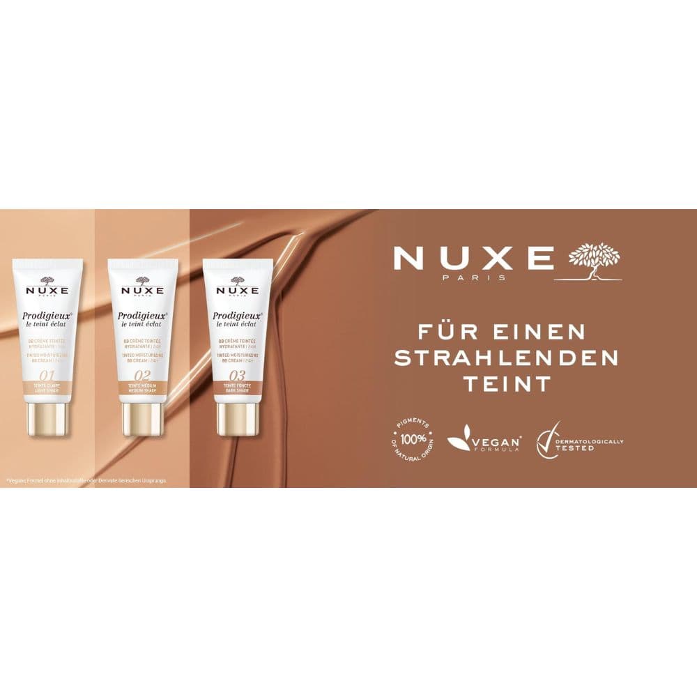 With the NUXE Prodigieux® Le Teint Eclat Tinted Moisturising BB Cream 02 Medium, you can give your skin an instantly even, naturally radiant finish - without any make-up look. The delicately melting texture with high-quality sweet almond oil provides your skin with intensive moisture throughout the day (24h) and gives it a silky, nourished feel.