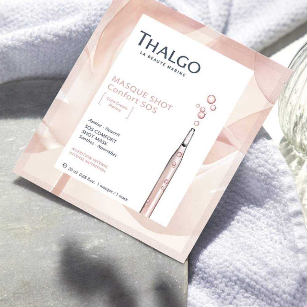 The Thalgo SOS Express Comfort Shot Mask is a fast-acting, soothing sheet mask designed to restore and nourish dry, tight, and sensitive skin. Infused with Thalgo’s patented Marine Cold Cream Complex, it combines algae oil, marine wax, and the deep-sea hydrating essence Sève Bleue des Océans to deliver long-lasting comfort and hydration.