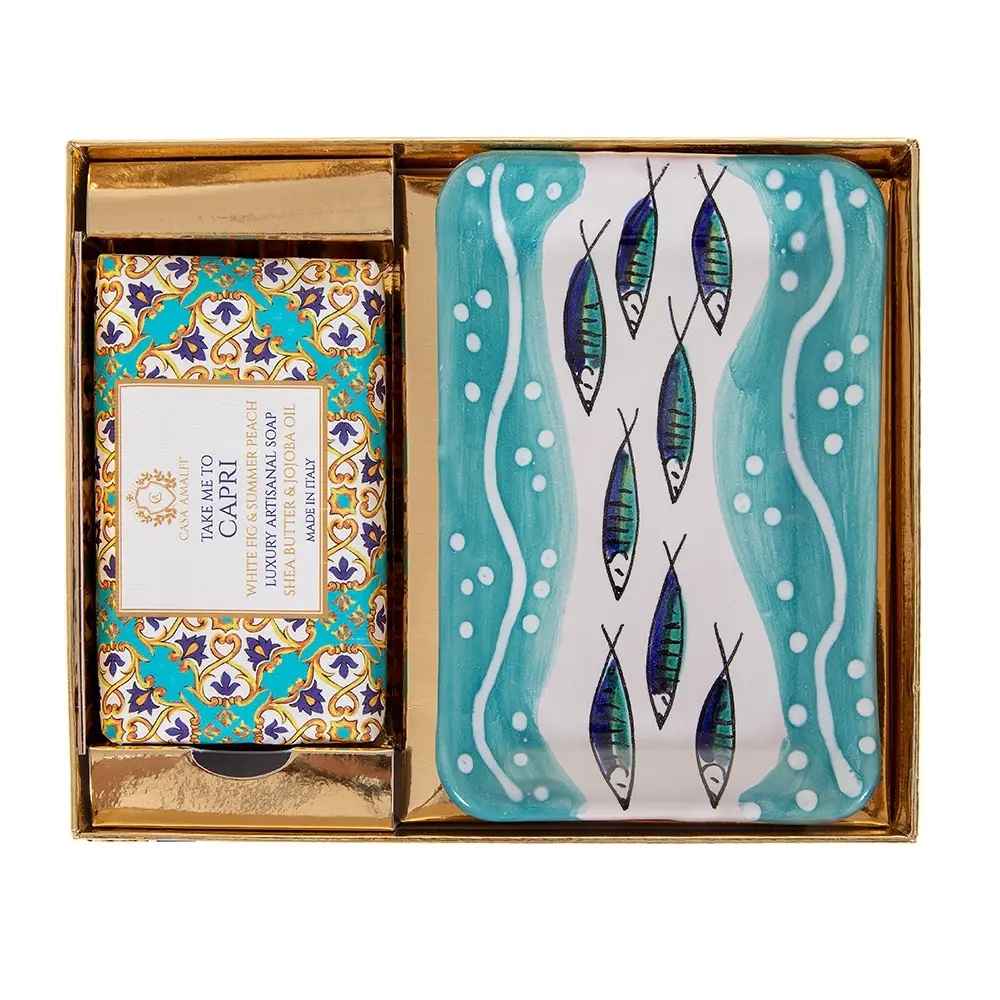 Packaged in an artfully designed majolica gift box, this elegant set contains a hand-painted ceramic soap dish and the exclusive "Take Me to Capri" body soap, enriched with the fresh essence of fig leaves and peaches - a fragrance reminiscent of sun-drenched afternoons, salty coastal breezes and Italian joie de vivre.