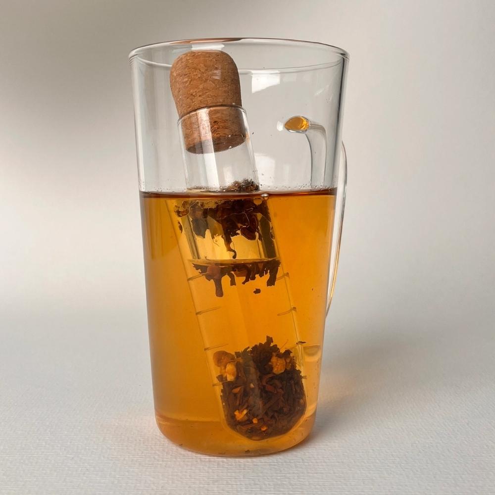 Make sure that the glass and cork strainer is clean before use. Rinse it with warm water to remove any residue. Fill the strainer with your favourite tea blend and make sure you choose the right amount for the cup or teapot, depending on the desired intensity. Place the strainer in a teacup or teapot and pour hot water over the tea leaves. Allow the tea to infuse according to the variety and desired strength. Remove the strainer after the desired brewing time and enjoy the freshly prepared tea.