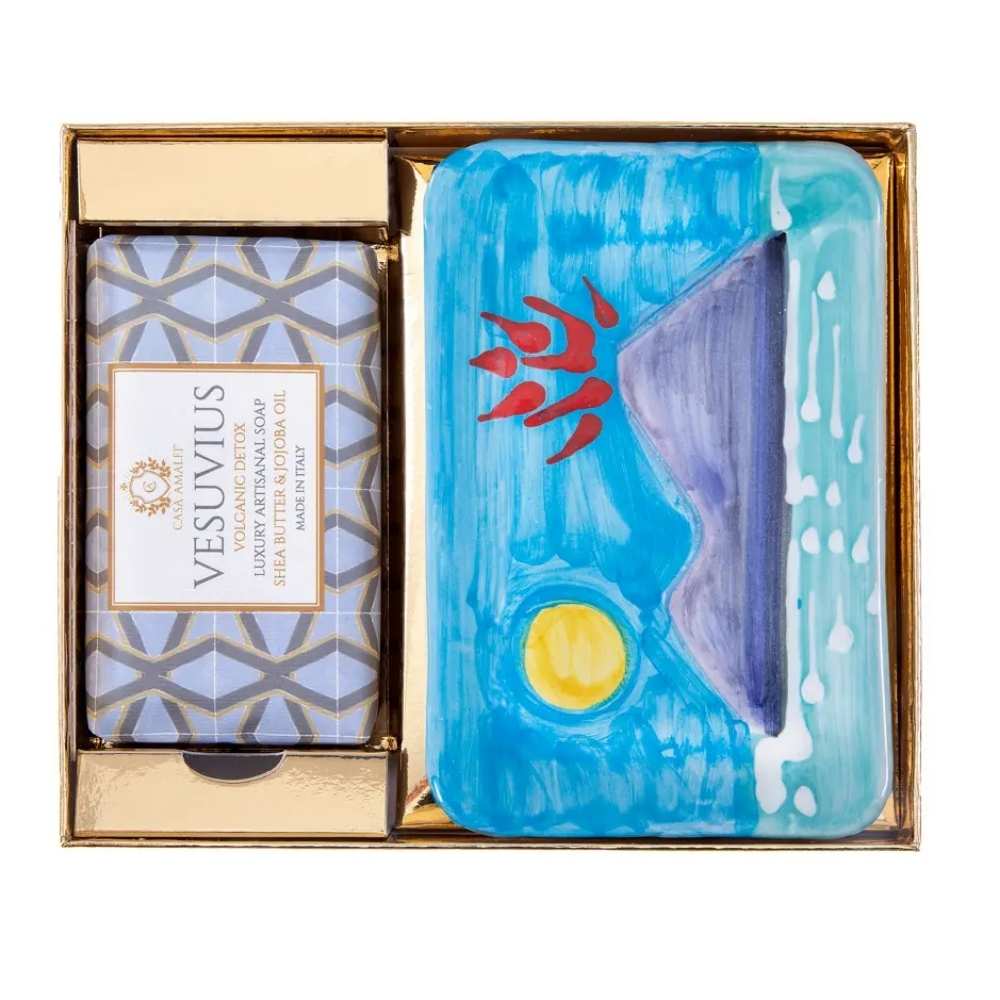 The set includes the Volcanic Detox body soap, inspired by the imposing Mount Vesuvius, combined with a hand-painted ceramic soap dish made by local artists on the Amalfi Coast.
