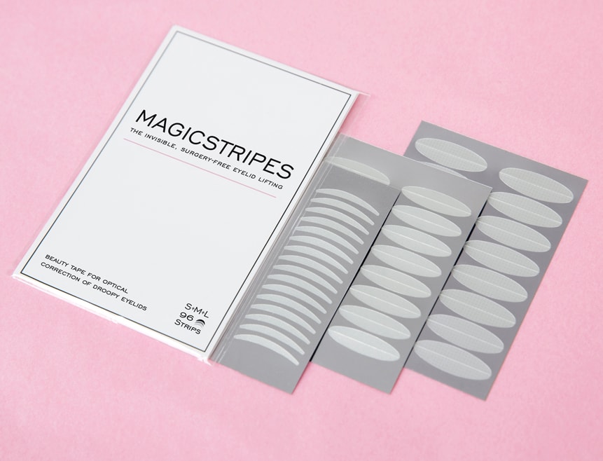 Magicstripes ist eine beeindruckende Beauty-Technik aus Japan, die zu den neuesten wissenschaftlichen und technologischen Errungenschaften auf dem Gebiet der Gesichtspflege zählt. Die Magicstripes Produkte glätten die Augenlider schnell und wohltuend und sorgen für eine frischere, straffere Haut – ganz ohne Visagistin. Die kleinen, innovativen Gesichtsmasken konzentrieren sich gezielt auf die Haut über den Augen und ermöglichen ein langanhaltendes Eyelid-Lifting, das die Haut sofort sichtbar strafft.