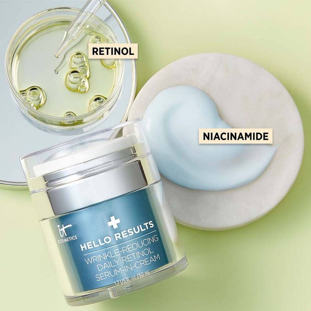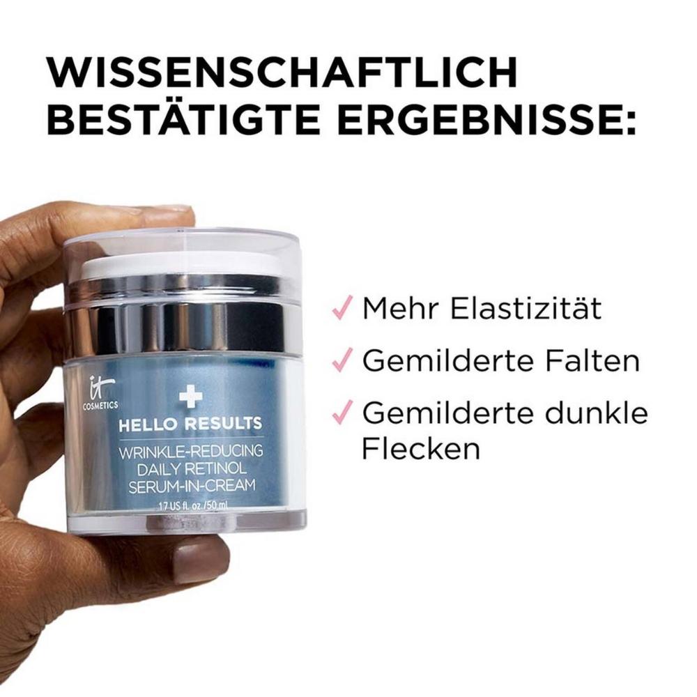 Die innovative Hello Results Wrinkle-Reducing Daily Retinol Serum in Cream von It Cosmetics kombiniert die intensive Wirksamkeit eines hochdosierten Anti-Aging-Serums mit der pflegenden Geschmeidigkeit einer Creme. Die einzigartige Formel aus freiem und verkapseltem Retinol sorgt nicht nur für eine sichtbare Minderung von Falten, sondern verbessert auch die Elastizität, Strahlkraft und Feuchtigkeitsversorgung der Haut, während Rötungen gemildert werden.