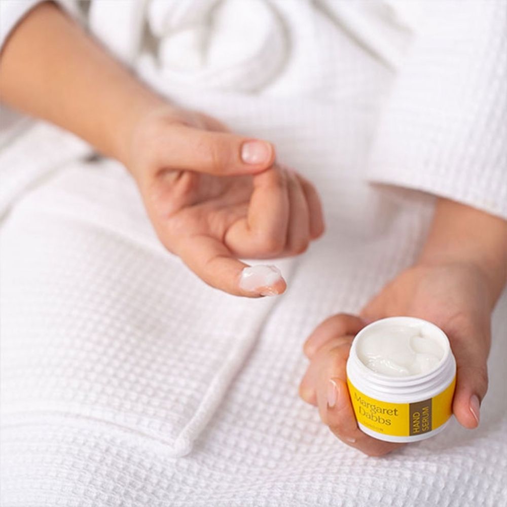 Das preisgekrönte Anti-Aging-Handserum von Margaret Dabbs London wirkt über Nacht und dreht die Uhr zurück für die Hände. Es reduziert Altersflecken, feine Linien und Fältchen und hinterlässt die Haut seidig, glatt und regeneriert.