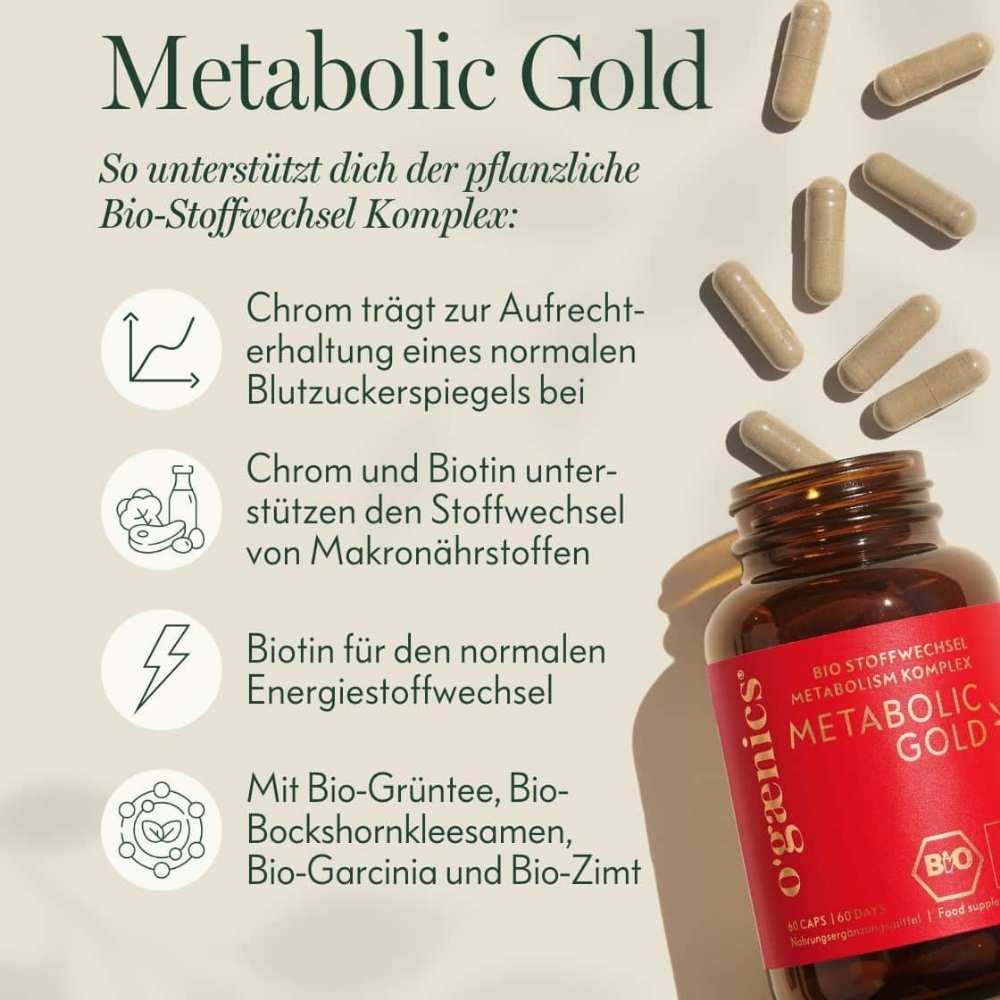 Metabolic Gold ist der pflanzliche Stoffwechsel-Booster in zertifizierter Bio-Qualität, der den Körper auf natürliche Weise bei einem aktiven Stoffwechsel unterstützt. Die einzigartige Formel kombiniert das klinisch erforschte Care300® mit pflanzlichem Biotin und Chrom, um den normalen Makronährstoff-Stoffwechsel zu fördern. Chrom trägt außerdem dazu bei, einen stabilen Blutzuckerspiegel aufrechtzuerhalten – ideal für alle, die Energie, Balance und Vitalität im Alltag suchen.