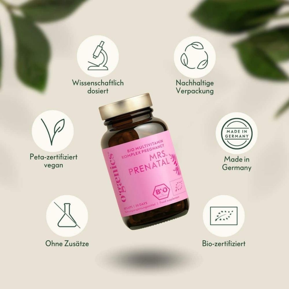 Mit Ogaenics MRS. PRENATAL erhältst du ein komplettes, bio-zertifiziertes Multivitamin, das dich und dein Baby zuverlässig durch die Schwangerschaft und Stillzeit begleitet – natürlich, wirksam und kompromisslos rein.