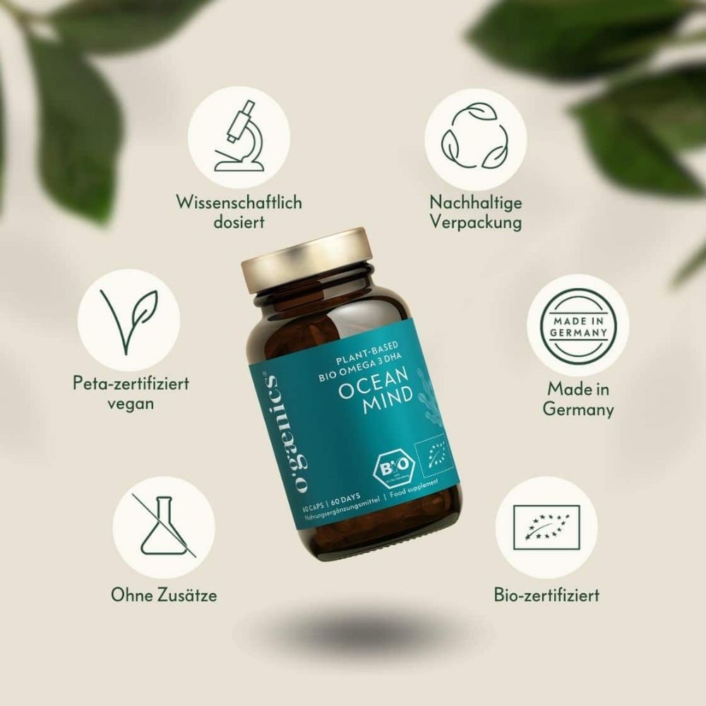 Ogaenics Ocean Mind ist die perfekte Wahl für alle, die Gehirn, Augen und Nervensystem auf natürliche Weise unterstützen möchten – mit der rein pflanzlichen, bio-zertifizierten Alternative zu Fischöl.