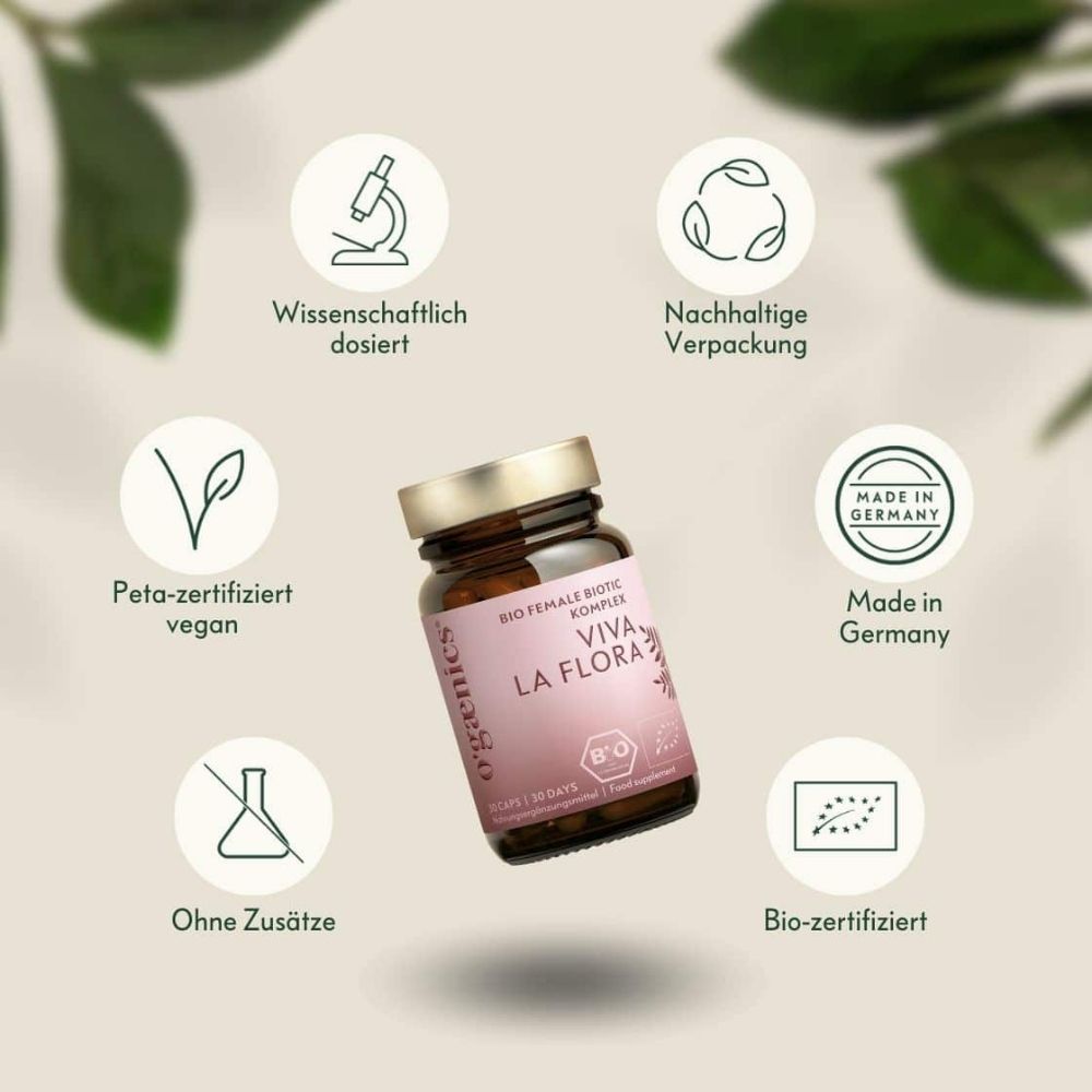 Viva La Flora kombiniert Präbiotika, Biotin und klinisch getestete Probiotika in einer hochwertigen, bio-zertifizierten Kapsel, um Frauengesundheit und Wohlbefinden effektiv zu unterstützen.