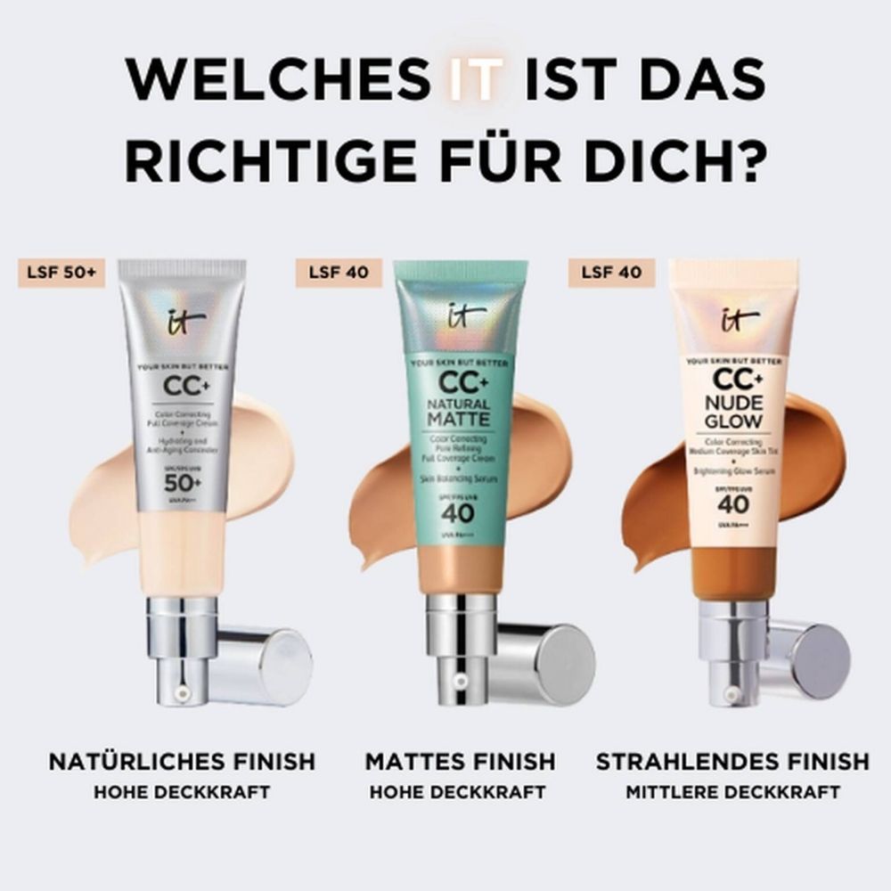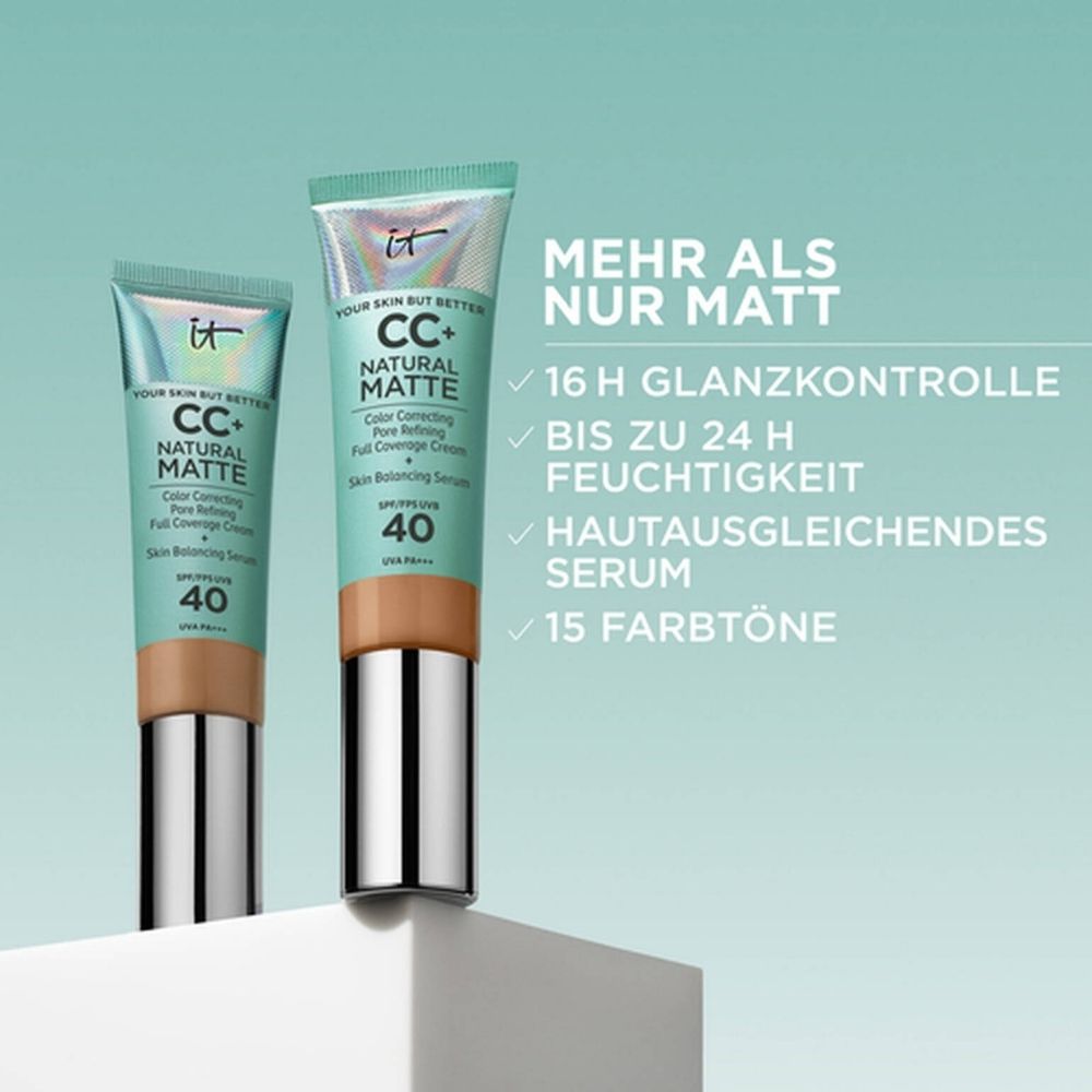 Die Your Skin But Better CC+ Cream Natural Matte Foundation SPF40 von It Cosmetics reduziert nicht nur Glanz und deckt Unregelmäßigkeiten ab, sondern pflegt die Haut gleichzeitig mit wertvollen Seren und bietet einen Sonnenschutz mit LSF 40.