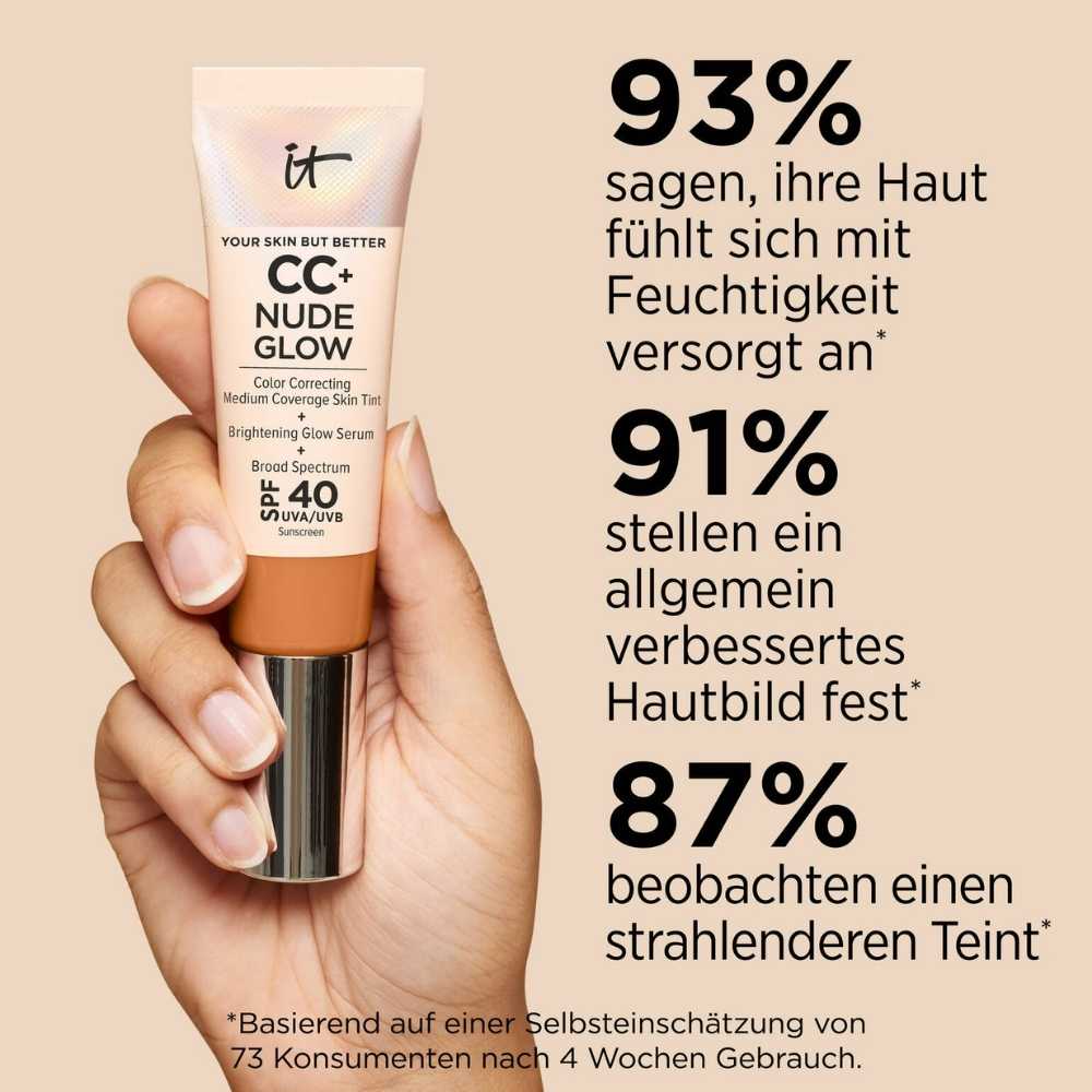 Die Your Skin But Better CC+ Nude Glow SPF 40 von It Cosmetics wurde in Zusammenarbeit mit Dermatologen und plastischen Chirurgen entwickelt und ist die erste CC+ Cream mit 90 % hautpflegenden Inhaltsstoffen. Sie verleiht deiner Haut sofort ein natürliches Strahlen und sorgt innerhalb von nur vier Wochen für sichtbar gepflegtere Haut.